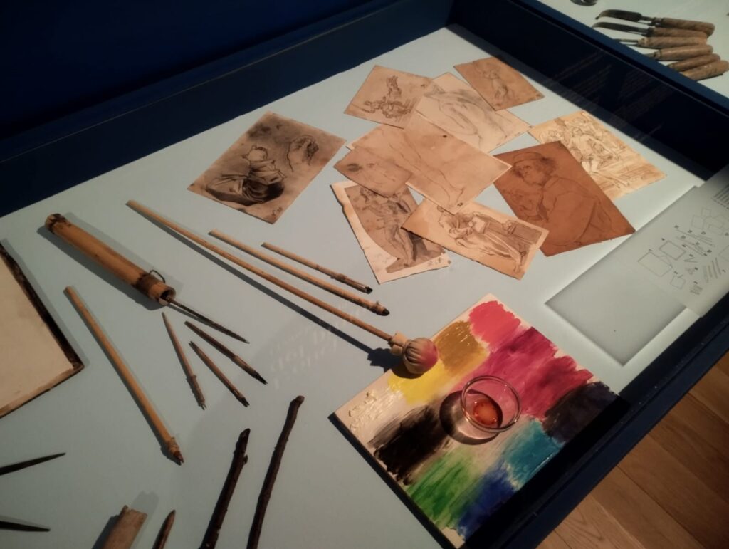 A més, com diu el títol d’aquella exposició, vàrem poder veure “la tècnica, la materialitat i la innovació” que va suposar. En la sala estaven estratègicament col·locades les eines que empraven a l’època per a pintar, per a confegir els diversos colors. En Ximo ens va explicar les tècniques, procediments i materials que usava en Paolo da San Leocadio. Les imatges UVL ens van permetre descobrir les repintades que es donen en algunes taules així com els estudis que fan els experts amb els mitjans que la ciència proporciona ara.